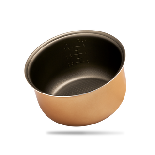 Der Innentopf unseres Reiskochers ist sehr robust. Sollte er aber dennoch einmal zerkratzen oder ersetzt werden müssen, haben wir den Innentopf auch noch als Ersatztopf im Angebot. Er eignet sich auch wunderbar als Zusatztopf, falls man mal mehr Gäste hat und gleich zwei Ladungen Reis hintereinander zubereiten möchte. Die Optik kann, je nach Charge, vom Bild abweichen. Qualitativ sind natürlich keine Unterschiede feststellbar. Der Innentopf besteht aus doppelt antihaftbeschichtetem Aluminium und ist mit einem Muster am Boden ausgestattet, sodass der Reis nicht anbrennt. Gegen Aufpreis ist der Innentopf auch mit einer Keramikbeschichtung erhältlich. Der Innentopf ist sehr hochwertig verarbeitet, was sich allein schon an seinem Gewicht von 320g bemerkbar macht. Innentöpfe preislich vergleichbarer Reiskocher haben eine wesentlich mindere Qualität und wiegen gerade einmal die Hälfte.