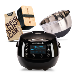 … gibt es unsere Digi Black Box! In ihr versammeln sich 4 Premium Produkte in elegantem Schwarz, die deinen Reisgenuss auf das nächste Level bringen. Die praktische Reis Waschschüssel ist der ideale Ort für ein herrliches Reisbad – perfekt also, um unseren bissfesten, intensiv erdigen Schwarzen Bio Reis zu waschen und anschließend im Digitalen Reiskocher auf den Punkt zu garen. Dank der stylischen Bento Box kannst du den fertigen Reis super easy für den nächsten Tag vorbereiten. Das Beste ist, dass du mit dem Set ein richtiges Schnäppchen machst. Wenn das nicht mal die ideale Geschenkidee für deine Liebsten ist.