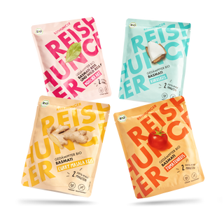 Du magst Vielfalt und stehst auf Abwechslung? Wir auch! Bei dir geht nichts über ein leckeres, schnell zubereitetes Gericht – am besten auch noch in Bio-Qualität? Uns geht’s genauso! Deswegen lieben wir unsere Express Reissorten im praktischen Probier Set. Nie wieder langweiliges Mittagessen, ewiges Kochen oder miese Fertigpampe. Entdecke die 4-fache Abwechslung mit unserem fruchtigen Basmati Tomatenreis, unserem angenehm würzigen Basmati Wild Reis Mix Indischer Art unserem nussigen Basmati Kokos Reis und unserem würzigen Basmati Curry Masala Reis!