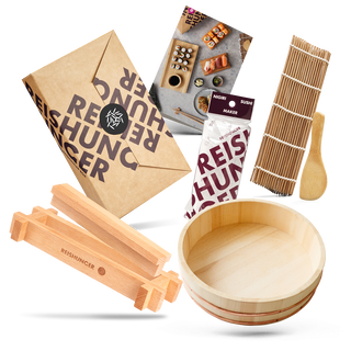 Man könnte sie auch als das Rundum-sorglos-Paket der Sushi Zubereitung bezeichnen. Sie enthält eine Einsteiger Hangiri Schüssel, einen Premium Sushi Maker, eine Nigiri Sushi Form und eine Sushi Rollmatte. Damit ist sie perfekt für einen Sushiabend mit Freunden oder der ganzen Familie geeignet. Die vielfältigen Utensilien stellen sicher, dass wirklich jeder etwas zum Sushi Schmaus beitragen kann.