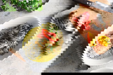 Roter Reis trifft Asien, ist das Motto von diesem Rezept. Der leicht kräftige Geschmack des roten Reis harmoniert perfekt mit der asiatischen Tahin-Soße, die mit grüner Curry Paste verfeinert wurde. Die Zucchini-Spaghetti geben dem ganzen Gericht noch den entsprechenden Pfiff und machen es zudem schön leicht. (C)