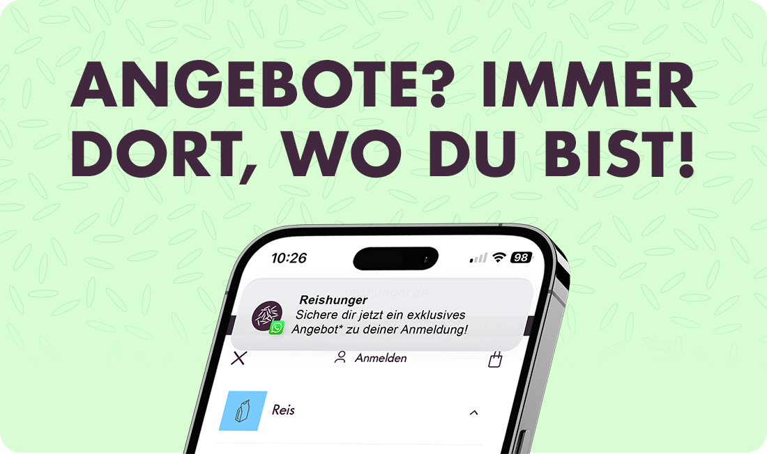 Du hast Lust auf exklusive Angebote, heiße Deals und Geschenke? Dann melde dich jetzt zum Reishunger WhatsApp Newsletter an und verpasse nichts mehr!