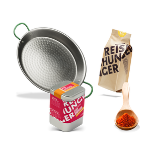 Die Grillpfanne ist eine originale „Paellera“ aus Spanien und eignet sich vor allem für das Grillen und Braten über offenem Feuer. Unser Reis von der Sorte "Albufera" hat die perfekte Konsistenz für eine echte spanische Paella. Unsere Bio-Gemüsebrühe ist extra auf Reisgerichte wie die traditionelle Paella Valenciana ausgelegt und bildet die perfekte Basis. Zum Würzen ist eine fein abgestimmte Paella-Gewürzmischung in bester Bio Qualität enthalten. Mit Safranfäden höchster Premium Qualität kannst du das Gericht anschließend veredeln.