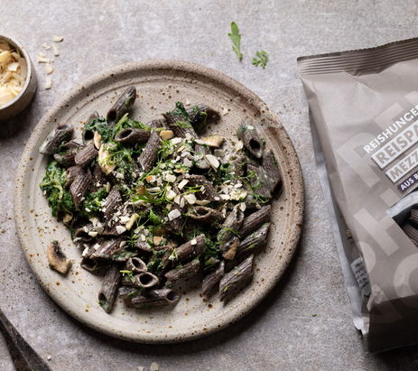 Eine sehr beliebt, glutenfreie Pasta Alternative ist Buchweizenpasta. Mit ihrem nussigen Geschmack ist sie nicht nur superlecker, ihr dunkle Farbe macht sie außerdem zu einem absoluten Hingucker auf dem Teller. Perfekt für cremige Saucen oder nussigem Pesto.