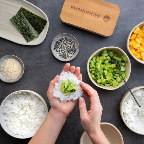 Die Zubereitung von Onigiris geht mit ein wenig Übung schnell von der Hand. Für die Füllung brauchst du keine teuren oder exklusiven Zutaten – in das Onigiri kommt, was die Fantasie erlaubt und das Herz begehrt. Auch beim Thema Zubehör gibt es gute Nachrichten: Die Reisbällchen kannst du ganz einfach mit der Hand formen. Wichtig jedoch ist, einen guten Sushi Reis zu verwenden, da dieser die Basis deiner Onigiris ist.