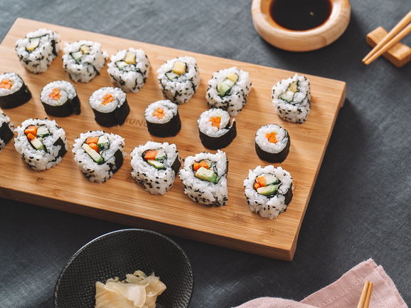 Die Zubereitung von Sushi Reis funktioniert am einfachsten im Reiskocher. Unser Digitaler Reiskocher hat einen eigenen „Sushi“ Modus, der auf das Kochen der Rundkorn Reissorte ausgelegt ist. Mit ihm heißt es: Reis waschen, im Reis-Wasser-Verhältnis 1:1,25 in den Innentopf geben und Reiskocher im richtigen Programm einschalten. Dann wird der Sushi Reis schön weich und klebrig – eben genauso wie Sushi Reis werden soll. Anschließend den Sushi Reis in die Hangiri geben und die Reisessigmischung vorsichtig durch den Reis ziehen. Danach kann das mit dem richtigen Sushi Equipment direkt losgerollt werden!