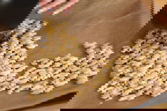 - Zunächst müssen die Cashewkerne geröstet werden. Verteile dazu die Cashewkerne auf dem Backblech. Für ca. 10 bis 15 Minuten bei 150 Grad Umluft kommen sie anschließend in den Ofen. Alternativ gibst du die Cashewkerne in eine Pfanne und röstest diese so lange an, bis sie leicht gebräunt sind.