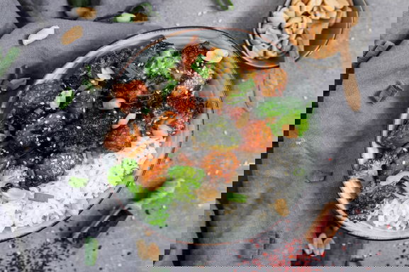 Als Beilage zum marinierten Tofu eignet sich Basmati Reis ideal. Sein intensiver, erdiger Eigengeschmack ist die perfekte Ergänzung bei herzhaften Gerichten mit Tofu. Der Basmati Reis hat ein langes Korn und einen leichten Biss – das sorgt für eine spannende Konsistenz zum marinierten Tofu. Als Topping bringen Erdnüsse noch einen zusätzlichen Biss in das Tofugericht.