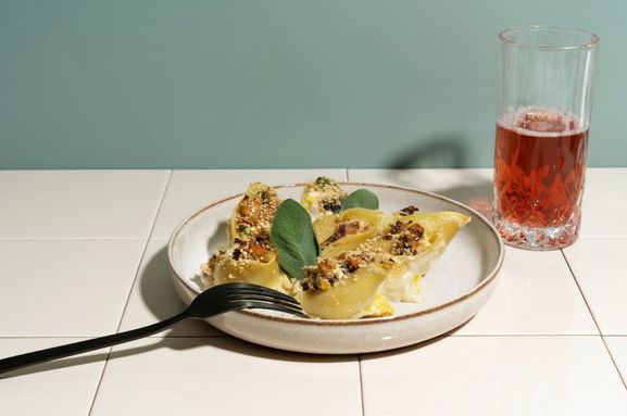 Nudeln? Aber gefüllt! Conchiglioni sind große Muschelnudeln, die sich perfekt zum Füllen und Überbacken eignen. Mit Kürbis, getrockneten Steinpilzen und einer Béchamelsauce der wahrgewordene Pastatraum. Für die gefüllten Nudeln die Conchiglioni vorkochen und mit etwas Olivenöl beträufeln. Zwiebeln und Kürbis schneiden und andünsten und zuvor eingeweichte Pilze hinzugeben. Anschließend vom Herd nehmen und Petersilie, Salz und Frischkäse hinzufügen. Für die Béchamelsauce eine Mehlschwitze herstellen und Milch, Safran und Salz hinzufügen. Die Sauce dann in die Auflaufform geben. Danach die Muschelnudeln befüllen, in die Form geben und mit veganem Parmesan garnieren. Den Nudelauflauf bei 180 ° etwa 15 Min. backen, bis die Oberfläche goldbraun ist.