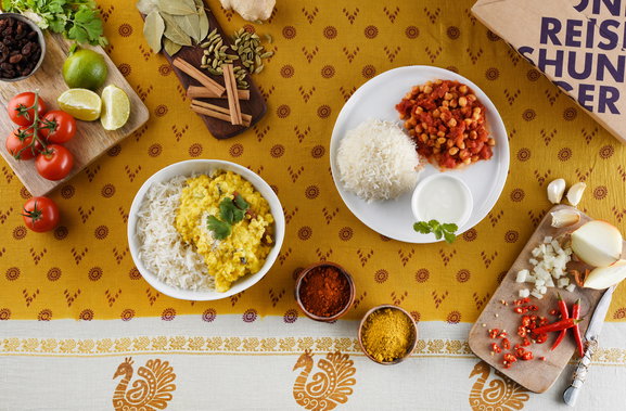 Riechst du den Mix aus intensiven Gewürzen und lockerem Basmati Reis? Das kann doch nur eine unserer indischen Kochboxen sein! Mit ihnen hast alle Grundzutaten für cremiges Butter Chicken, fruchtiges Madras Curry und vielen weiteren indischen Gerichten beisammen und kannst direkt loslegen.