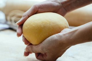 - Sobald das Mehl weitgehend mit den Eiern vermischt ist, den Teig mit den Händen weiter kneten, bis ein glatter und elastischer Teig entsteht. Wenn der Teig zu trocken ist, füge etwas Wasser hinzu. Ist er zu klebrig, gib etwas Mehl hinzu.